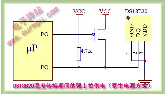 改進的寄生電源供電方式如下面圖5所示,為了使DS18B20在動態轉換周期中獲得足夠的電流供應,當進行溫度轉換或拷貝到E2存儲器操作時,用MOSFET把I/O線直接拉到VCC就可提供足夠的電流,在發出任何涉及到拷貝到E2存儲器或啟動溫度轉換的指令后,必須在最多10μS內把I/O線轉換到強上拉狀態。在強上拉方式下可以解決電流供應不走的問題,因此也適合于多點測溫應用,缺點就是要多占用一根I/O口線進行強上拉切換。