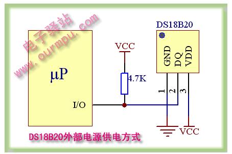 外部電源供電方式是DS18B20最佳的工作方式,工作穩定可靠,抗干擾能力強,而且電路也比較簡單,可以開發出穩定可靠的多點溫度監控系統。站長推薦大家在開發中使用外部電源供電方式,畢竟比寄生電源方式只多接一根VCC引線。在外接電源方式下,可以充分發揮DS18B20寬電源電壓范圍的優點,即使電源電壓VCC降到3V時,依然能夠保證溫度量精度。