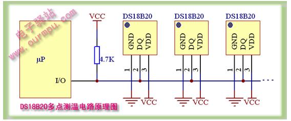 注:永陽工程曾經就此電路做過實驗,在實驗中,降低電源電壓VCC,當低于4.5V時,測出的溫度值比實際的溫度高,誤差較大。。。當電源電壓降為4V時,溫度誤差有3℃之多,這就應該是因為寄生電源汲取能量不夠造成的吧,因此,站長建議大家在開發測溫系統時不要使用此電路。