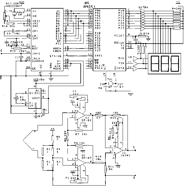 下面介紹一個典型的單片機控制的測溫系統,它由三大部分組成:(1)測量放大電路;(2)A/D轉換電路;(3)顯示電路。它廣泛應用于發電廠、化工廠的測溫及溫度控制系統中。